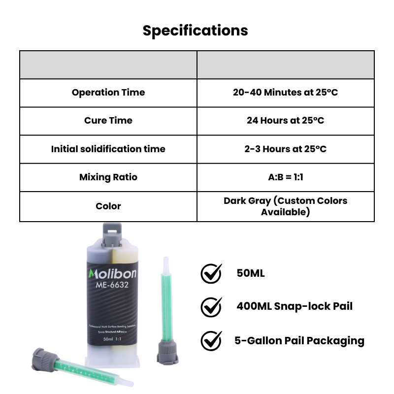 The two part epoxy adhesive is a versatile and medium-thickness epoxy glue. With a simple 1:1 mix ratio, the solvent-free structural adhesive offers excellent bond strength for versatile transportation applications.The 50ml bonding adhesive cures at room temperature or can be heat-cured to accelerate the process.