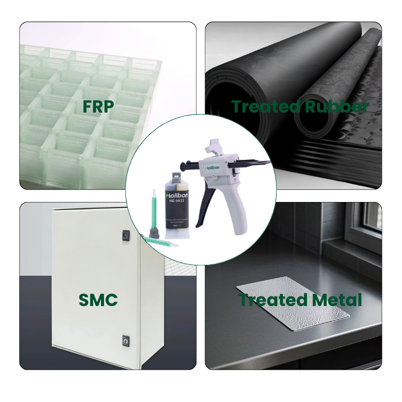 It is suitable for bonding treated metals, FRP, SMC, treated rubber materials, and various other substrates.